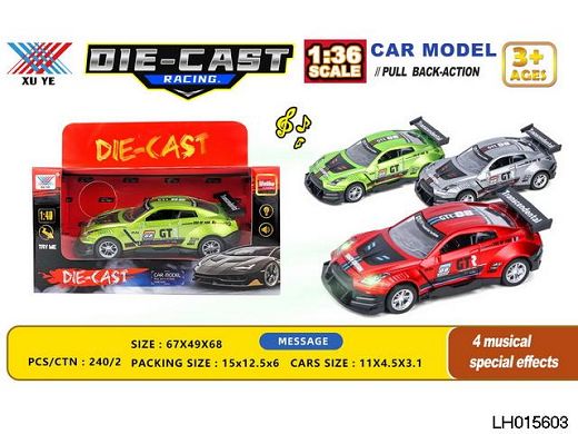 产品名称: 1:40 灯光音乐合金回力车(1只装)